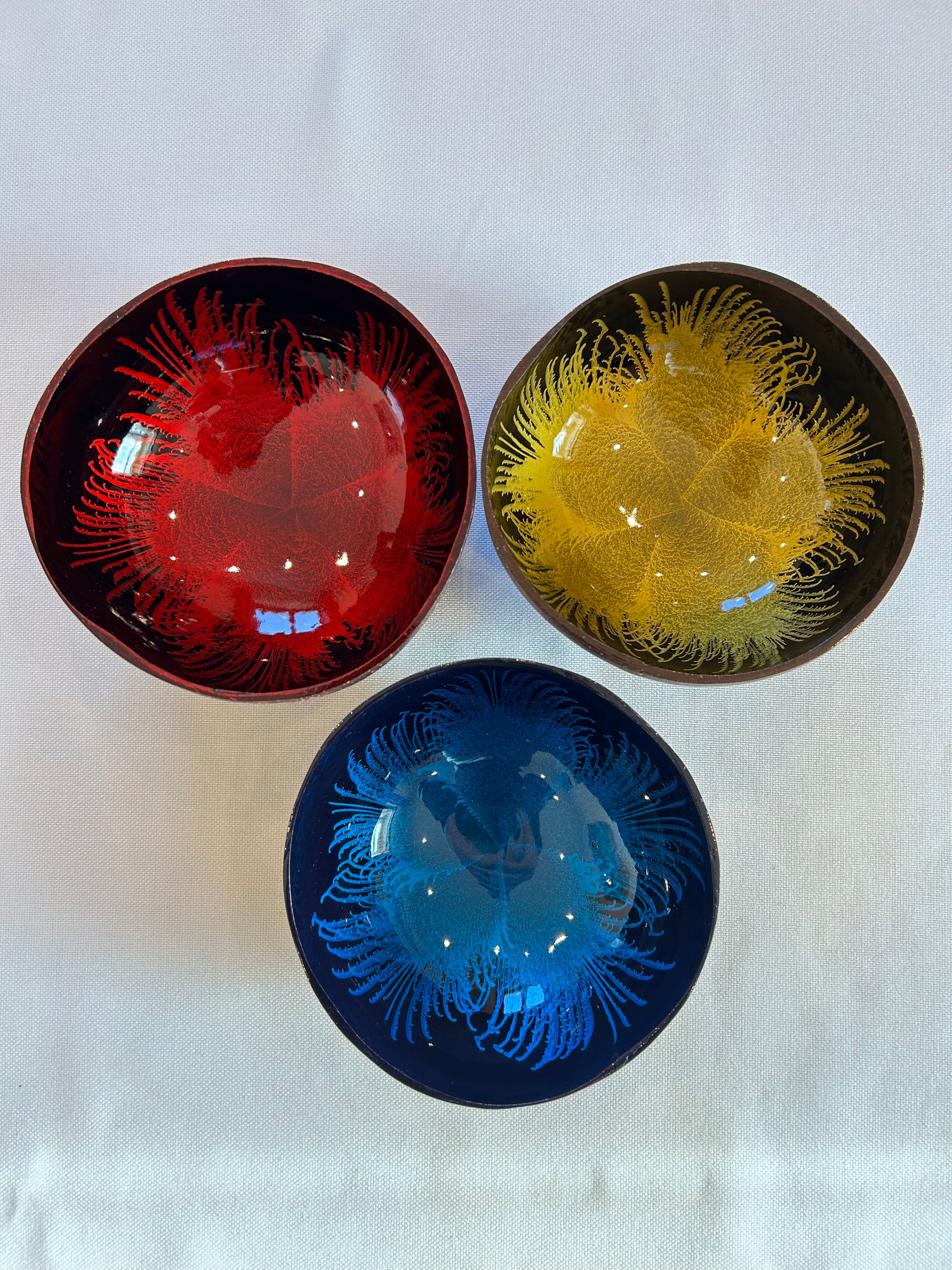 Die Kokosnussschalen werden sorgfältig geschnitten, gereinigt und geschliffen, bevor sie mit Bio-Kokosöl außen poliert werden. Jede Kokosnussschale ist von Natur aus ein Unikat, geprägt durch ihre individuelle Farbe, Form und Größe.